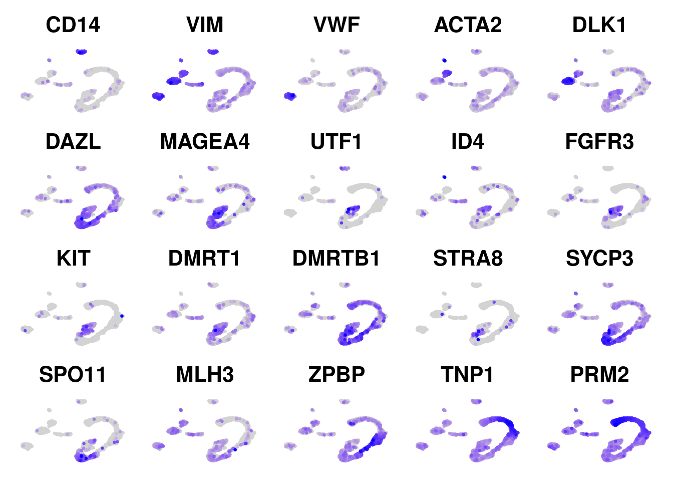 FeaturePlot(obj, features = c("CD14", "VIM", "VWF", "ACTA2", "DLK1", "DAZL", "MAGEA4", "UTF1", "ID4", "FGFR3", "KIT", "DMRT1", "DMRTB1", "STRA8", "SYCP3", "SPO11", "MLH3", "ZPBP", "TNP1", "PRM2"), ncol=5, order=TRUE) & NoAxes() & NoLegend()Warning: The `slot` argument of `FetchData()` is deprecated as of SeuratObject 5.0.0.