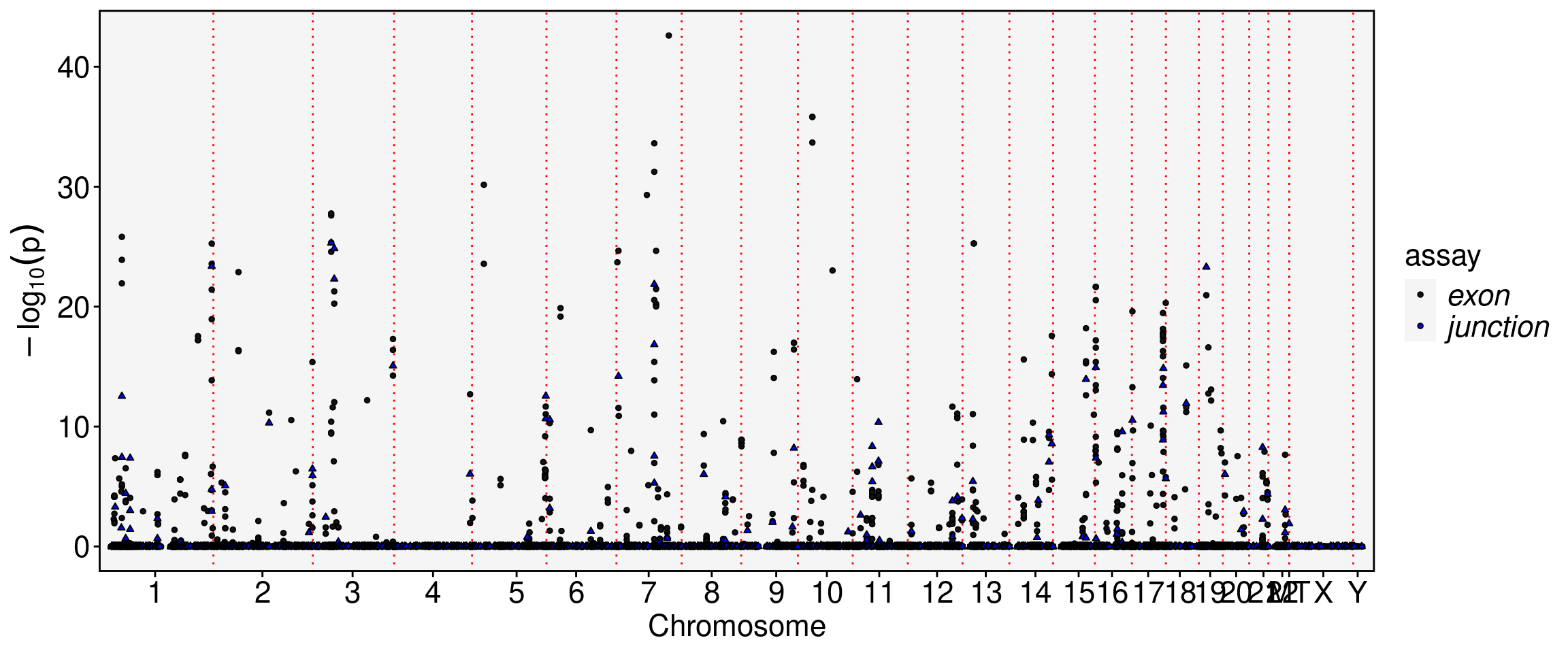 FbtPlot(obj.sel, val = "ccc.padj", assay = c("exon", "junction"), shape.by = "assay", color.by = "assay")