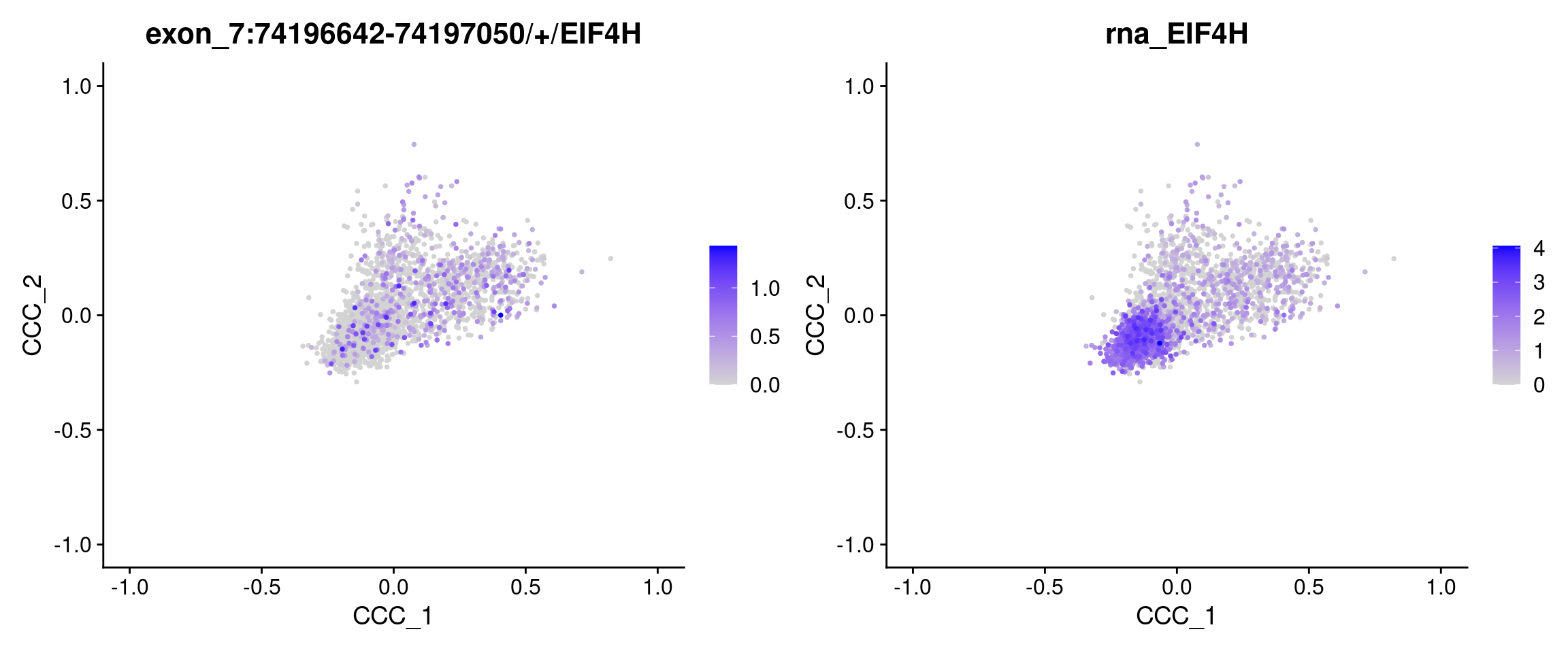 FeaturePlot(obj.sel, reduction = "ccc", features = c("7:74196642-74197050/+/EIF4H", "EIF4H"), order = TRUE)Warning: Could not find 7:74196642-74197050/+/EIF4H in the default search